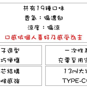 其他口味:薄荷、冰紅茶、咖啡、哈密瓜、奇異果、彩虹糖、冰橙、沙士、烏龍茶、番石榴、百香果、紅酒冰、芒果、芒果奶昔、芒果百香果、茉莉龍井、荔枝、菠蘿、蔓越莓、薄荷口香糖、藍莓、鐵觀音、、香芋冰淇淋,風味多樣,層次豐富。